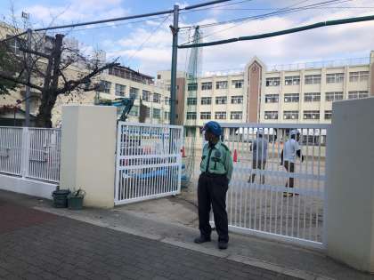 工事関係者が立って、児童の登下校の安全を確認しています。運動会が終わったら、校舎内にフェンスが接され、運動場が狭くなります。