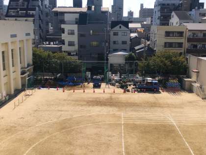 運動会終了後に校舎改修工事が実施されます。それに伴い、運動場に工事車両が侵入するために、新南門の外の道路舗装工事がありました。