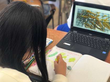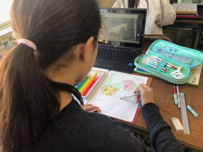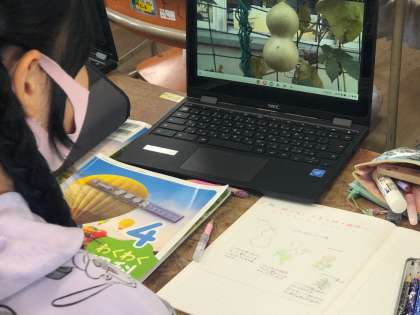 4年生の理科は、植物を育てようの学習です。校舎の壁に沿って育っているひょうたんやその他の植物について、一人一台端末で撮影し、ノートに書き写しました。