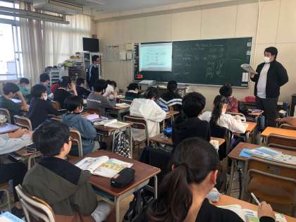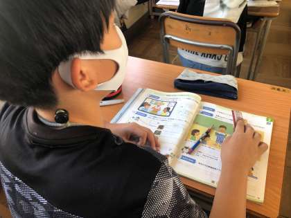 6年生の英語は、教科書74・75頁に沿って、各地でできることを伝えようという学習です。友だちの出すクイズをヒントも聞きながら答えました。