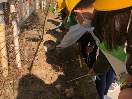 3年生の理科では、かげと太陽の単元から、ひなたとひかげの地面の温度について実験して調べています。温度計の使い方や目盛りの見方も学びました。