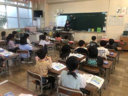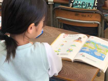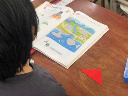 1年生の算数は、かたちづくりの単元です。今日は、カラーの色板を使って、教科書105ページの形を作りました。三角を2つ使って四角にしたり、三角や四角の形をならべて、いろいろな形にしました。