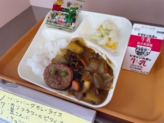11月7日(火)、今日の給食は「ハンバーグカレーライス・カリフラワーのピクルス・豆こんぶ・牛乳」です。
