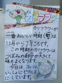 カリフラワーはこれからが旬の野菜です。和名で「花椰菜(はなやさい)」といい、花のつぼみの部分を食べる野菜です。今日は、コーンといっしょにピクルスにしています。