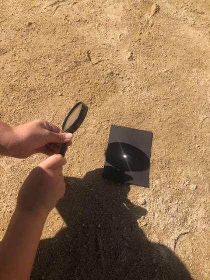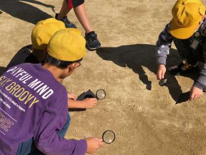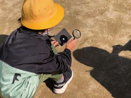 3年生の理科は、光のせいしつです。この日の学習では、運動場に出て、虫めがねを使って日光を集めました。実験をするときの注意事項をいろいろ守って、黒い画用紙に集めました。小さく集めると明るくなって、画用紙を焦がしました。