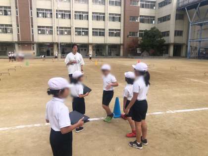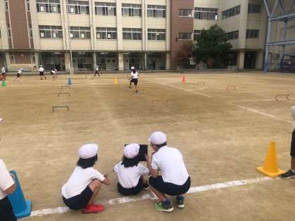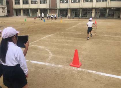 2年生の体育では、ハードル走に挑戦しています。リズミカルな走りで、滑らかにハードルを越すことに取り組んでいます。今日は、一人一人の運動の様子を端末でとって、自分の跳び方を確認しました。