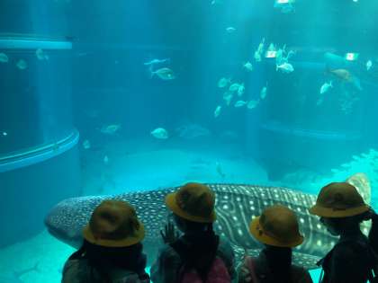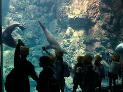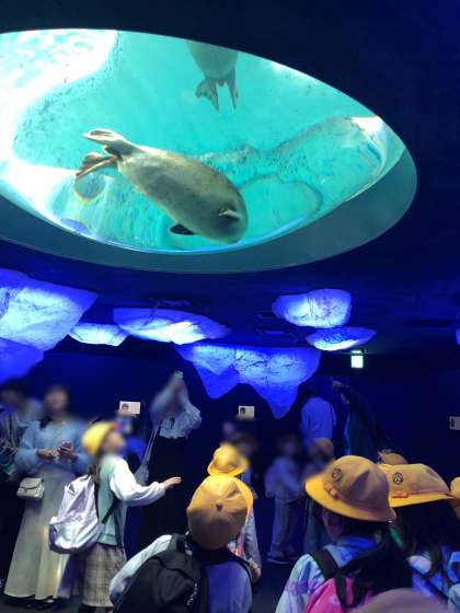 イルカやアシカが水槽の中から子どもたちを迎えています。子どもたちと一緒に遊んでいるみたいでした。