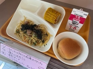 給食では、えのきたけ、エリンギ、しいたけ、しめじ、なめこ、まいたけ、マッシュルームの7種類のきのこが登場しています。今日はしめじとしいたけが入った「ウインナーときのこの和風スパゲッティ」でした。きのこの食感も楽しめるパスタでした。