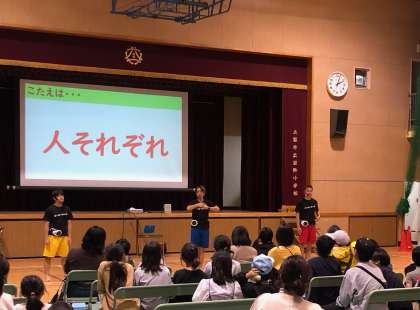 研修会の講師として、手話エンターテイメント発信団oioi(オイオイ)の皆さまをお迎えし、「手話でつながろう」という講演をしていただきました。オイオイの皆さまから、聴覚障がいの方の聞こえ方の実際について教えていただきました。また、手話を学んだり手話クイズをしたり、手話体操をしたりしました。