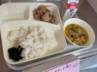 11月13日(月)、今日の給食は「豚肉のスタミナ焼き・すまし汁・のりのつくだ煮・ごはん・牛乳」です。