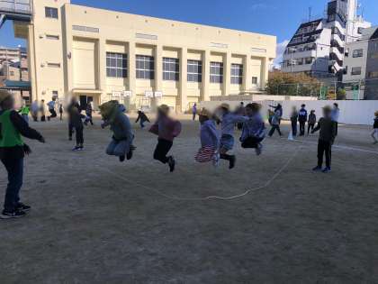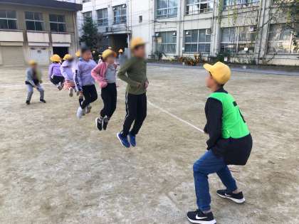 ナミーゴ班(異学年が混ざったグループ)で1つのチームになって、長なわとびの回数を競い合います。