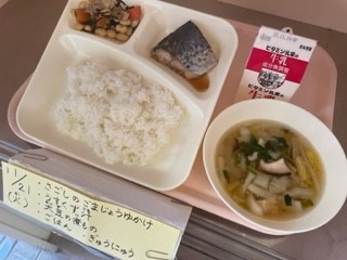 11月21日(火)、今日の給食は「さごしのごまじょうゆかけ・うすくず汁・大豆の煮もの・ごはん・牛乳」です。
