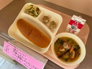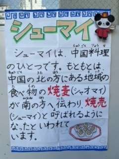 11月22日(水)、今日の給食は「焼きシューマイ・中華みそスープ・ツナと野菜のオイスターソースいため・黒糖パン・牛乳」です。