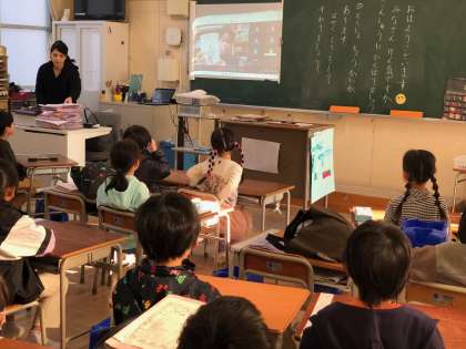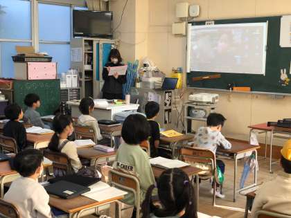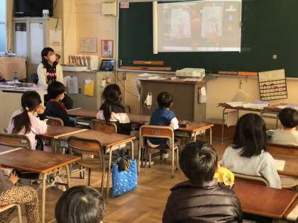 先生から、本の紹介がありました。1年生は興味津々で聴いていました。