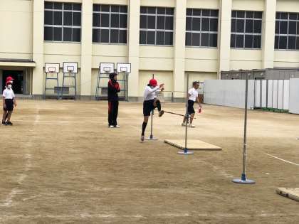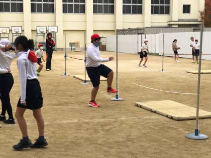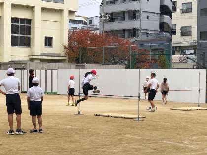 足を上げるタイミングを工夫しています。高く跳ぶために、リズミカルな助走や踏み切りの仕方などを考えながら練習しました。
