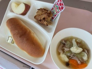 12月4日(月)の給食は「とうふローフ・カリフラワーのスープ煮・りんご・コッペパン・バター・牛乳」でした。