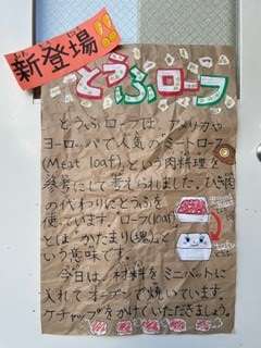 「とうふローフ」は新登場の献立です。以前登場した「とうふハンバーグ」をアレンジしています。とうふ、ツナ、粒状の大豆、たまねぎ、調味料を混ぜ合わせて、クラスごとに深型のバットに入れ、オーブンで焼いています。とうふハンバーグよりも香ばしく仕上がりました。