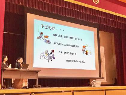 学校保健大会の講演会は、大阪公立大学現代システム科学研究科准教授の濱島先生、NPO法人ふうせんの会の佐治先生にお越しいただき、「ヤングケアラーを知っていますか?—学校と地域の役割を考える—」と題してご講演をいただきました。