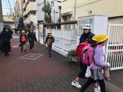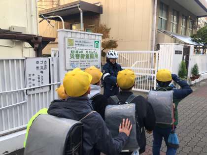 今朝の登校時に、港警察署のおまわりさんが登校の安全巡視をしてくださいました。区内の学校の通学時の安全にむけて、定期的に巡回されているとのことです。