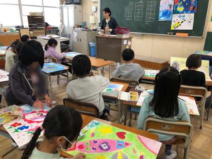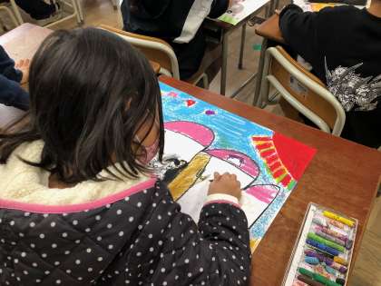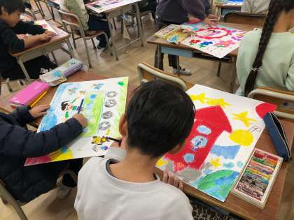 1年生の図工は、のってみたいな、いってみたいなという題材で、パスを使った絵画を制作しました。1年生の子たちそれぞれが夢のある作品に仕上げています。