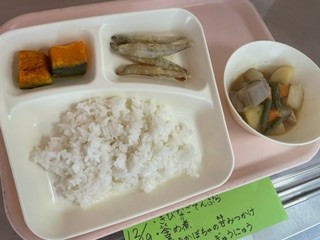 12月19日(火)、今日の給食は「きびなごてんぷら・含め煮・焼きかぼちゃの甘みつかけ・ごはん・牛乳」です。