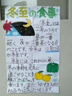 今日は冬至にちなんだ献立で「焼きかぼちゃ」が登場しました。日本では、昔から冬至に「ん」のつく食べ物を食べると、幸運を呼ぶとされ、「冬至の七種(ななくさ)」といわれます。かぼちゃ(なんきん)は、そのうちのひとつです。オーブンで焼いたかぼちゃに甘いみつをからめています。