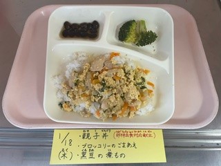 1月18日(木)、今日の給食は「親子丼【鶏卵の個別対応献立】・ブロッコリーのごまあえ・黒豆の煮もの・牛乳」です。