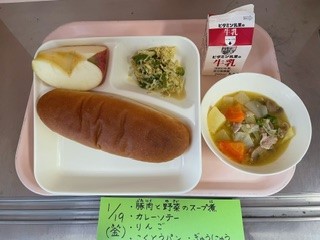 1月19日(金)、今日の給食は「豚肉と野菜のスープ煮・カレーソテー・りんご・黒糖パン・牛乳」です。