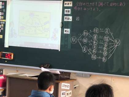 いろいろな行き方がありますが、道のりを一番短くする行き方を最終選択します。このような学習を通して、次は、全部の場合を調べずに見つけることができようになります。