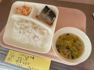 1月25日(木)、今日の給食は「さばのみそ煮・すまし汁・紅白なます・ごはん・牛乳」です。