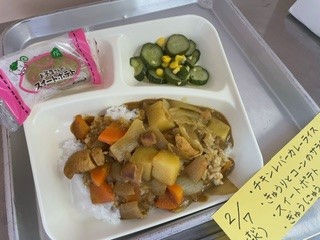 2月7日(水)、今日の給食は「チキンレバーカレーライス・きゅうりとコーンのサラダ・スイートポテト・牛乳」です。