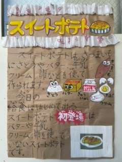 今日は、給食に初登場の「スイートポテト」が出ました。食物アレルギーのある児童も食べられるように牛乳・乳製品、卵は使用していません。やさしい甘さでこどもたちにも大好評でした。