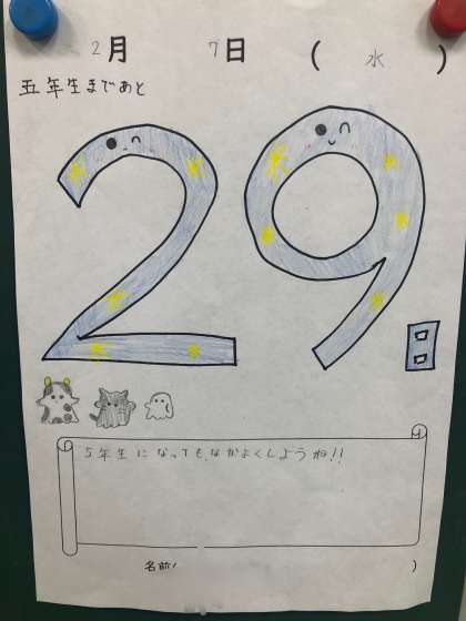 1つは、「5年生まであと29日」。本年度をカウントダウンしながら、いよいよ5年生、高学年へのわくわく感を感じました。