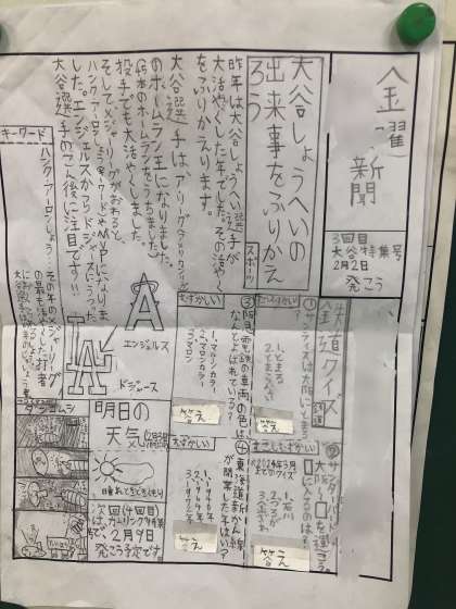 2つめは、「大谷翔平新聞」です。先日、大谷翔平選手から届いたグローブを、4年生の子どもたちも手にはめています。そんな大谷選手に関心をもって上手に新聞にまとめています。夢があっていいですね。