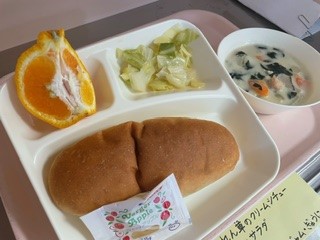 2月19日(月)、今日の給食は「ほうれん草のクリームシチュー・キャベツのサラダ・デコポン・コッペパン・りんごジャム・牛乳」です。