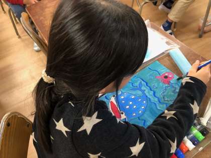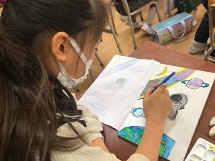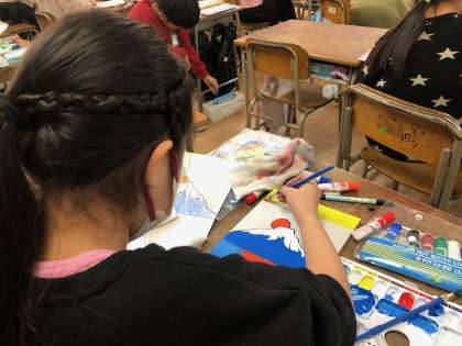 3年生は図工の学習で、くぎ打ちトントンという題材に取り組んでいます。最終的には、スマートボールやパチンコのようなものに仕上げます。今日は、台に絵を描いて水彩絵の具で縫って仕上げました。次は、台にくぎを打つ予定です。