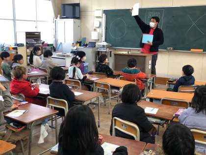 この日は、色あてビンゴです。C−NETの先生が、掲げる色カード、例えばgreen!といえば、自分のビンゴに緑色を塗っていればチェックできます。子どもたちは、しっかりと聴きながらビンゴゲームを楽しんでいました。