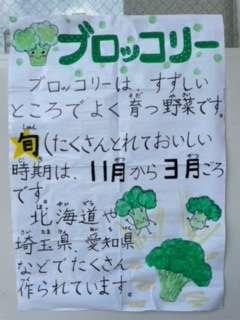 今日は、ブロッコリーをゆでて手作りのドレッシングで和えた「ブロッコリーのサラダ」でした。ブロッコリーは、茎の部分も使っているので、食物せんいがしっかりととれます。また、ドレッシングには、今年度3月まで使用可能な「りんご酢」を使っています。(りんご酢は新年度より食物アレルギー対応のため、使用されません。)