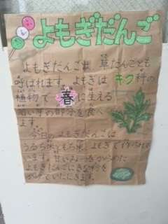 よもぎだんごは、よもぎの葉を練りこんで作られています。よもぎの香りと淡い緑色が特徴です。ひとり一袋のきな粉をかけていただきます。よもぎは体を温める働きがあります。また、肌荒れを防ぎます。