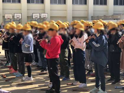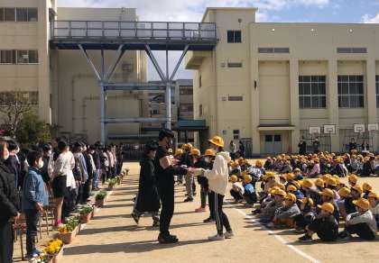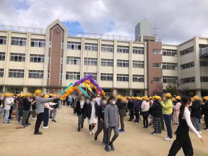 6年生からは、『未来へ』の歌と、学校を美しくするための手づくり雑巾を在校生へ贈りまました。そして、花のアーチをくぐって退場しました。