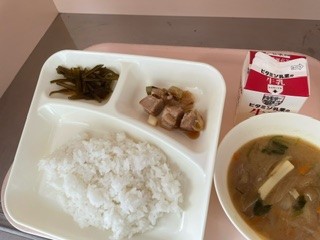 3月13日(水)、今日の給食は「まぐろの甘辛焼き・豚汁・くきわかめのつくだ煮・ごはん・牛乳」です。