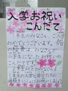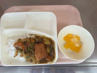 4月9日(火)、いよいよ新年度の給食がスタートしました。今日は1年生の入学をお祝いする入学祝い献立で「カツカレーライス・フルーツゼリー・牛乳」です。