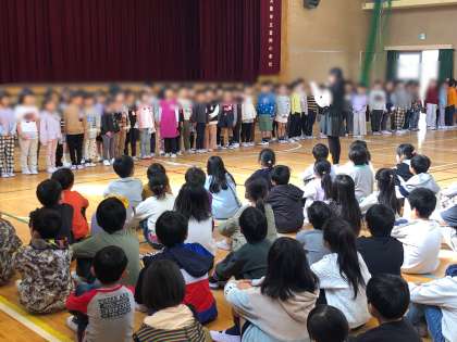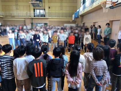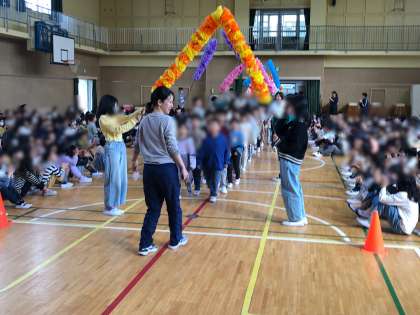新しい1年生は、2年生以上の児童と集会で初対面です。きれいな花のゲートをくぐり、講堂の前に1年生が整列しました。在校生からは、歓迎のことばを伝え、校歌を歌って届けました。そして、みんなで大きな拍手で、1年生を歓迎しました。