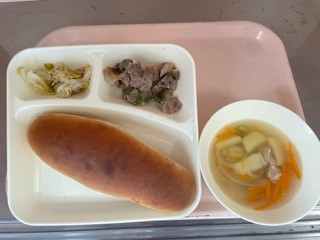 4月11日(木)、今日の給食は「豚肉のガーリック焼き・スープ・ツナとキャベツのソテー、黒糖パン・牛乳」です。