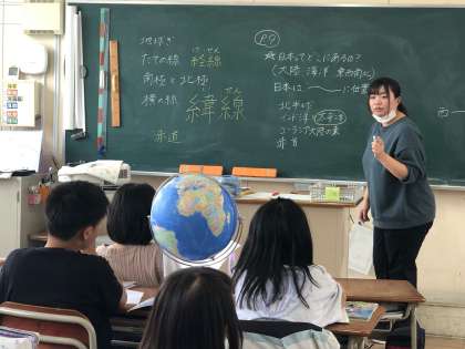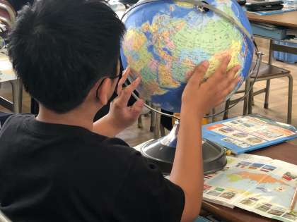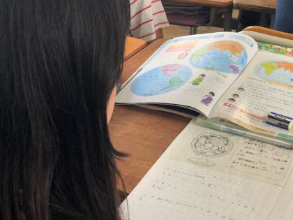 5年生の社会科は、「世界の中の国土」の単元です。地球儀や地図帳を活用し、太平洋やインド洋、ユーラシア大陸、北半球、経線緯線等の語句を用いて、日本の位置を調べています。