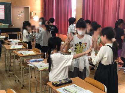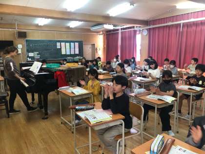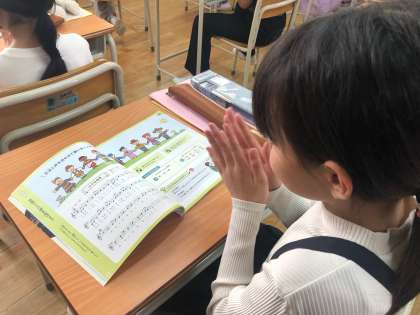旋律の特ちょうを漢字とって歌おうという学習のめあてです。拍にのって行進したり、足踏みしたり、歌のリズムで手合わせをしたりしました。