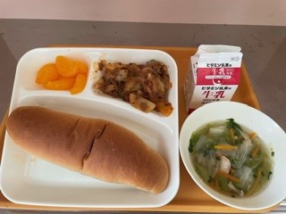 4月18日(木)、今日の給食は「じゃがいものミートグラタン・レタスのスープ・みかん(缶)・黒糖パン・牛乳」です。