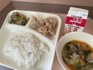 4月19日(金)、今日の給食は「鶏肉のからあげ・中華スープ・チンゲンサイともやしの甘酢あえ・ごはん・牛乳」です。