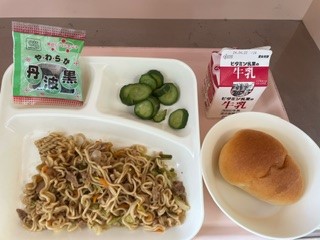 4月22日(月)、今日の給食は「焼きそば・きゅうりのしょうがづけ・ソフト黒豆・ミニコッペパン・牛乳」です。