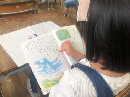 2年の国語は、「風のゆうびんやさん」の音読です。様子を思いうかべながら、読み方を工夫しています。